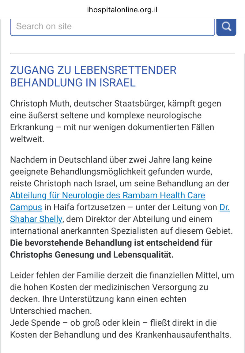 (Krankheitssituation, Spendenmöglichkeiten werden in Deutsch und Englisch geschildert)